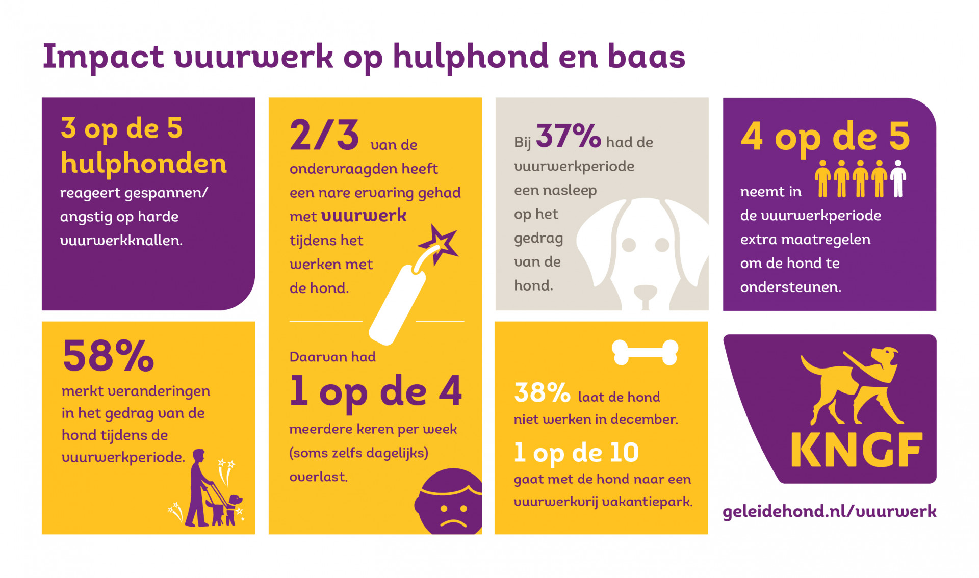In opdracht van KNGF Geleidehonden deed bureau Markteffect in 2021 onderzoek onder 292 cliënten met een blindengeleidehond, een assistentiehond voor naast de rolstoel of voor mensen met autisme of PTSS. Een kwart van de ondervraagden die nare ervaringen met vuurwerk benoemt, zegt dat dit in de aanloop naar oudejaarsavond wekelijks of zelfs dagelijks gebeurde.